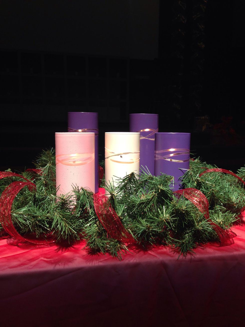 "Risers" to hold the back candlesWhite clothRed sheerBack candles on risersMiddle and front candlesGreenery shaped into a wreathRibbon woven thru the wreathLight the candles