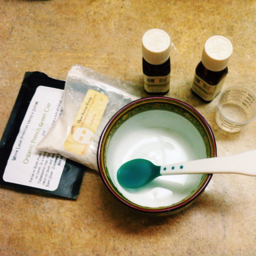 Gather the clay, oils, bowl, spoon, and measuring cup at the bathroom sink.