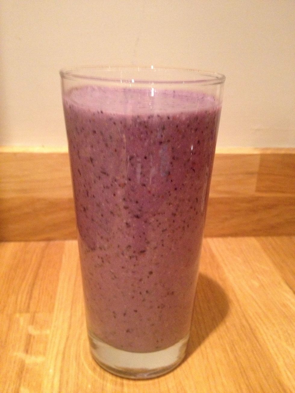 Add a small handful of almonds and two handfuls of blueberries and blitz with a hand blender until smooth. Add protein powder if desired.