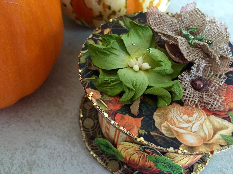 Take your newly altered ribbon spool and add it to a tabletop of gourds! Or, make a few more and use them as place card holders at your next Halloween party.