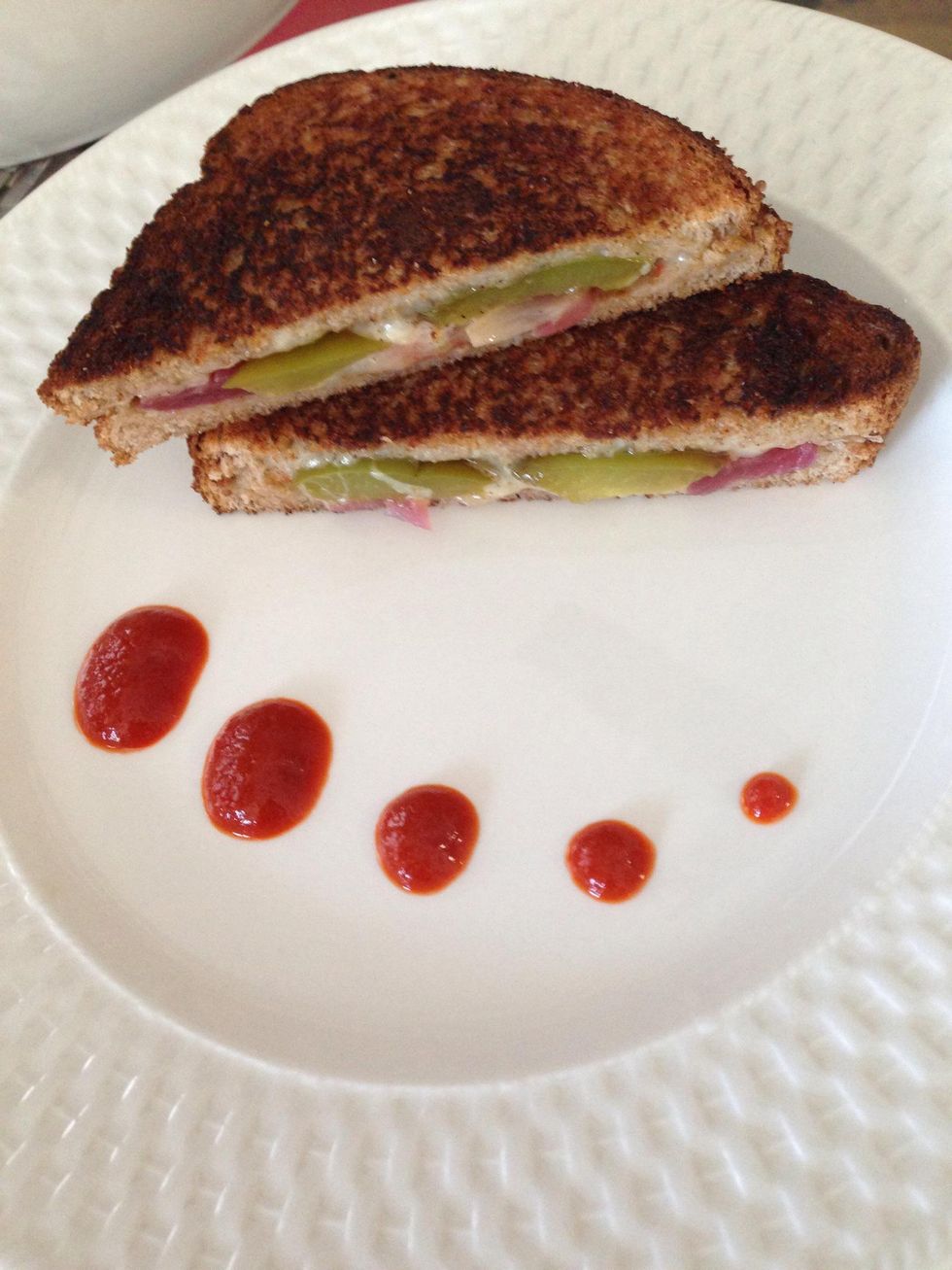 Put your panini press on the sandwich and at this point turn down the heat and let it sit for about a minute on each side.