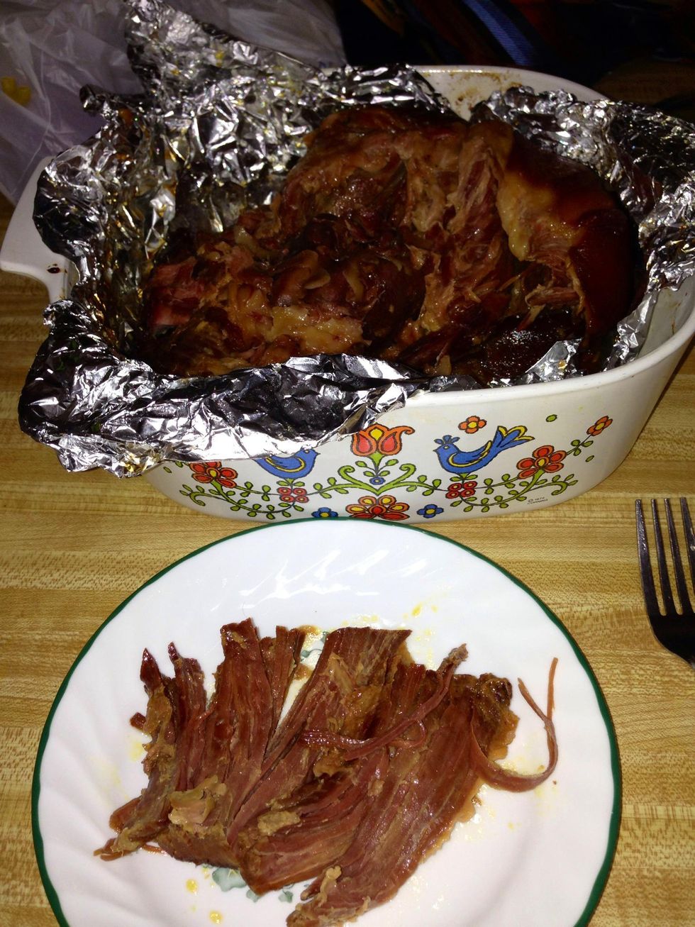 What you get is an amazingly moist, fall off the bone, ham. (Sorry that it looks like scavengers have devoured most of it. I forgot to take a pic before lunch :) ) I will never fix ham any other way.
