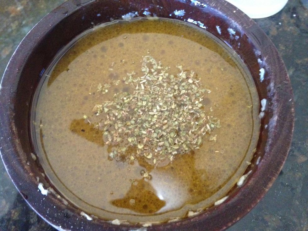 Pour 2/3 cup of extra virgin olive oil unto the mortar with garlic.