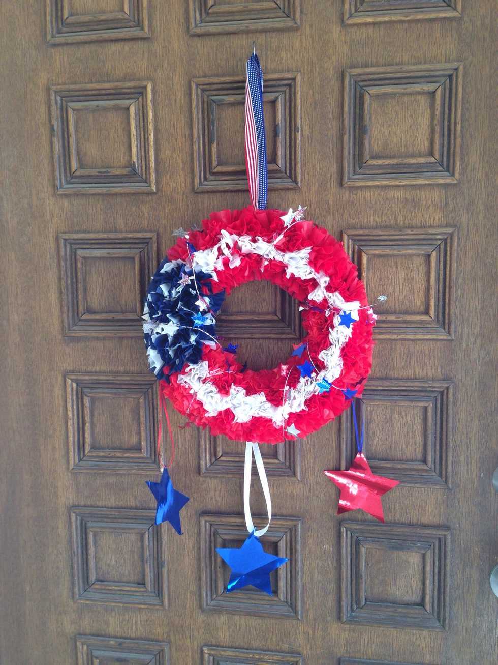 Tada!!! I used flag ribbon as the hanger. I got everything, except the wire frame, at the dollar store. I used my 50% off at JoAnns for the frame and spent a total of $10. I used two red tablecloths.