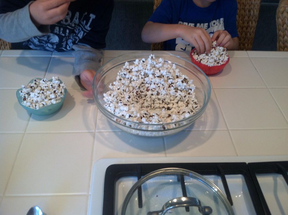 Once you hear a few seconds between pops and it slows down remove from heat and sprinkle with the sea salt