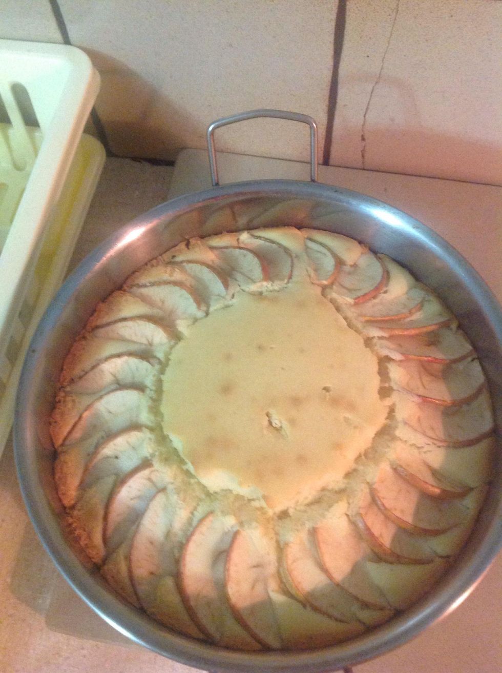 Mix butter and brown sugarAdd eggMix egg, butter and brown sugarAdd second eggMixAdd self -raising flour and normal flourAdd milkMixPour into panAdd apples on topCake out of oven
