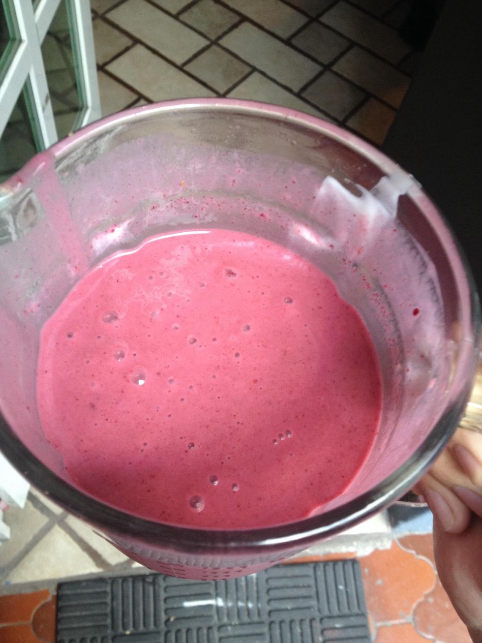 Add some ice cubes to make it thicker and blend it until you get this beautiful color! Remember that all of your fruit must be frozen!!!