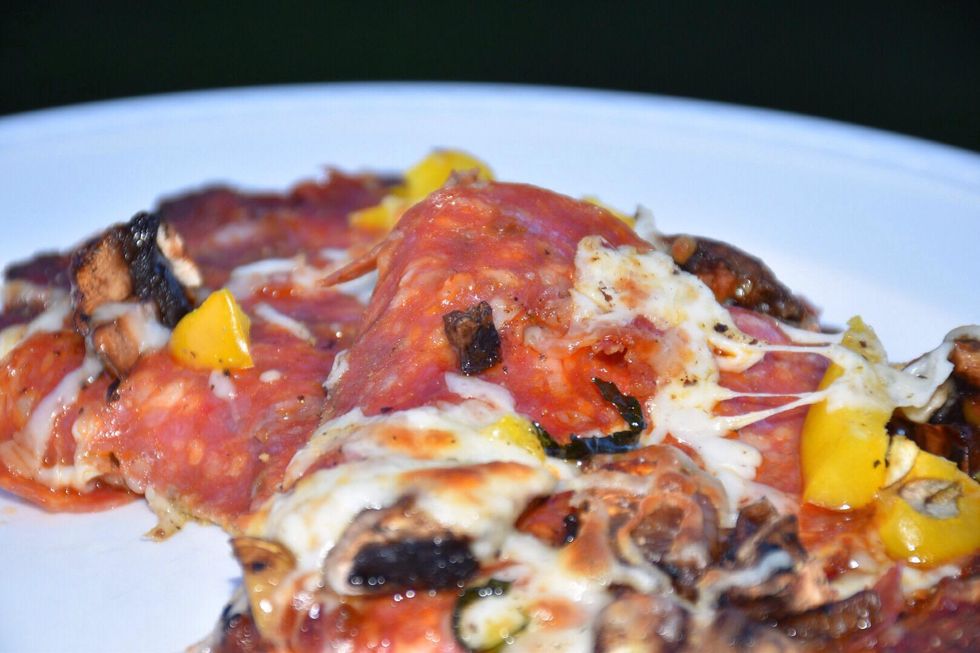 Layer cheese, sweet peppers, mushrooms, meat and more cheese.