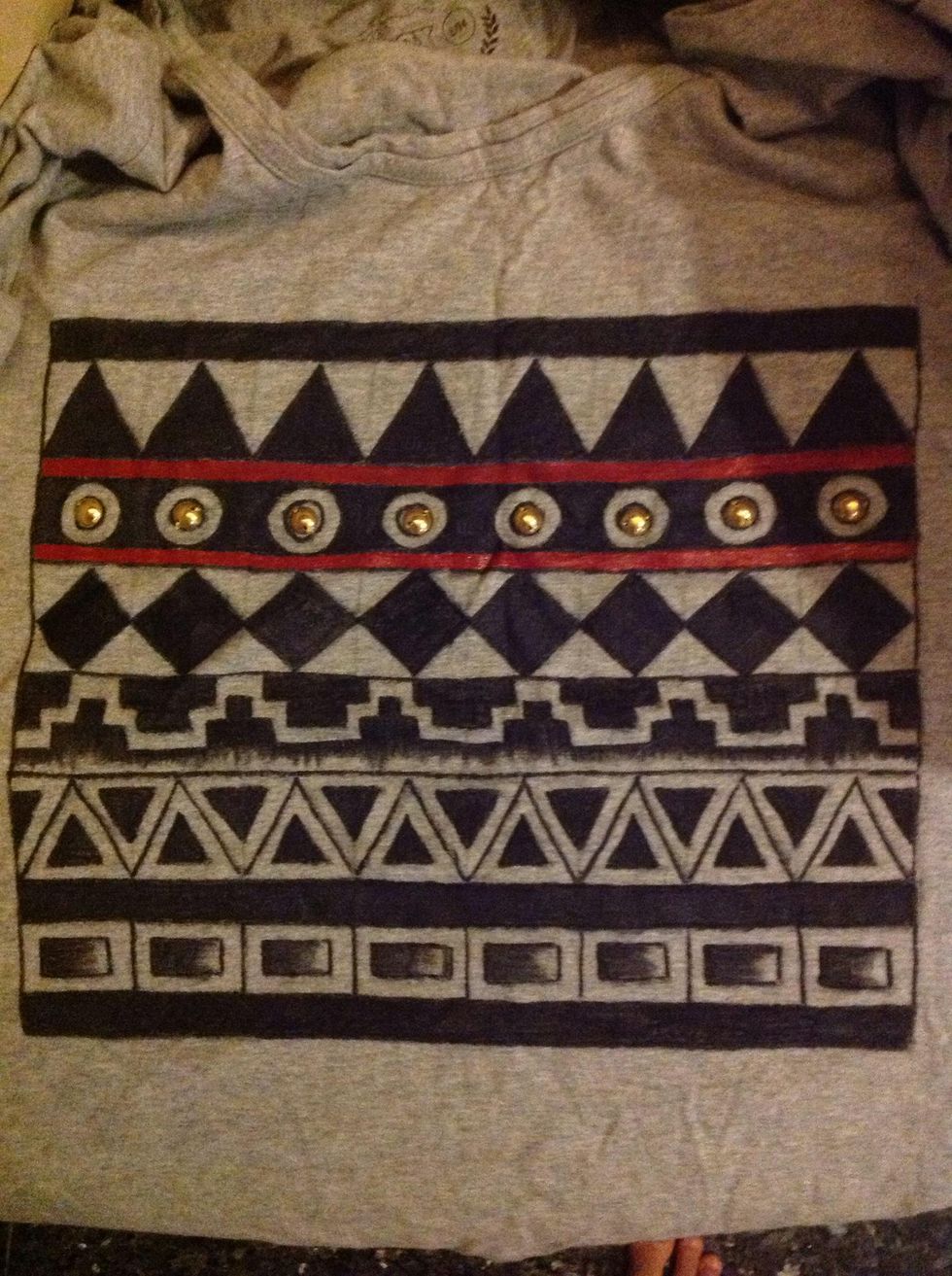 Draw out the desired design with a pencil. Go over the design with the fabric marker. If you want you can paint in the design. I've stitched a few round studs as well.Draw the design.The final piece