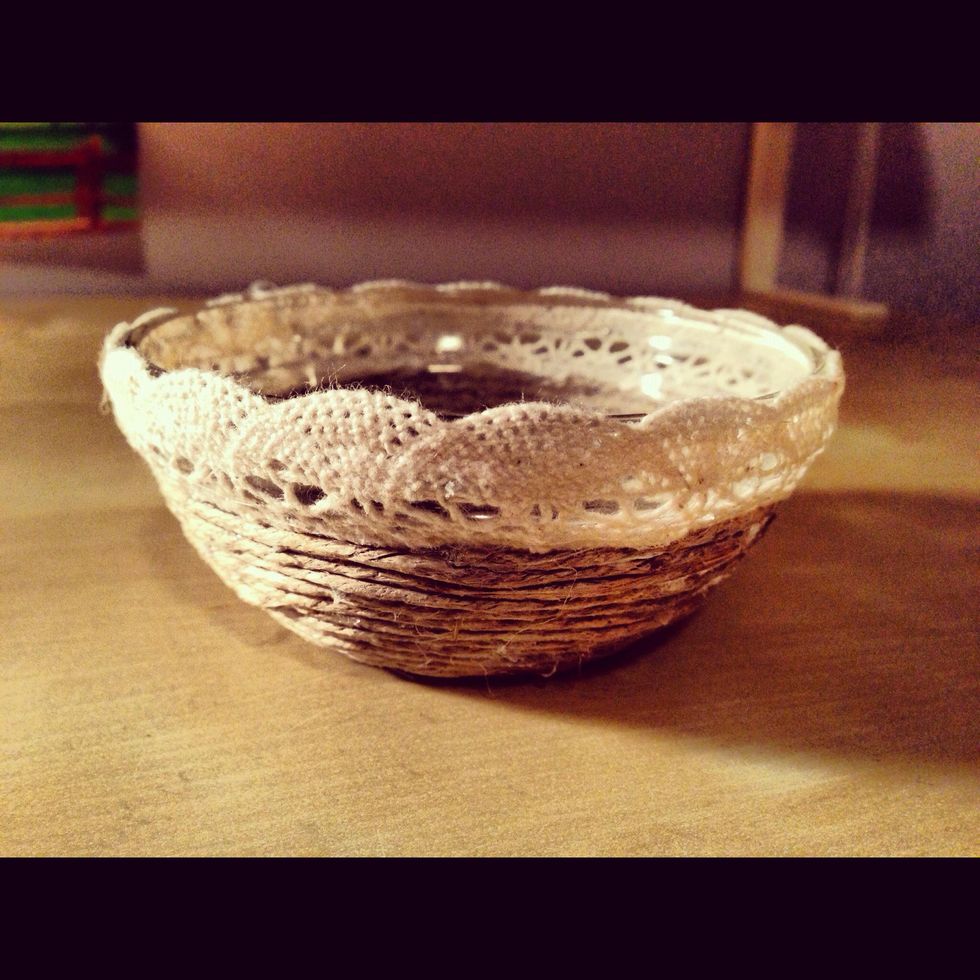 Start by glueing on lace like material on top. Then the hemp directly under it to have an even line to wrap it around. Make sure to put glue under the hemp. Not to thick as you don't want it to lump.