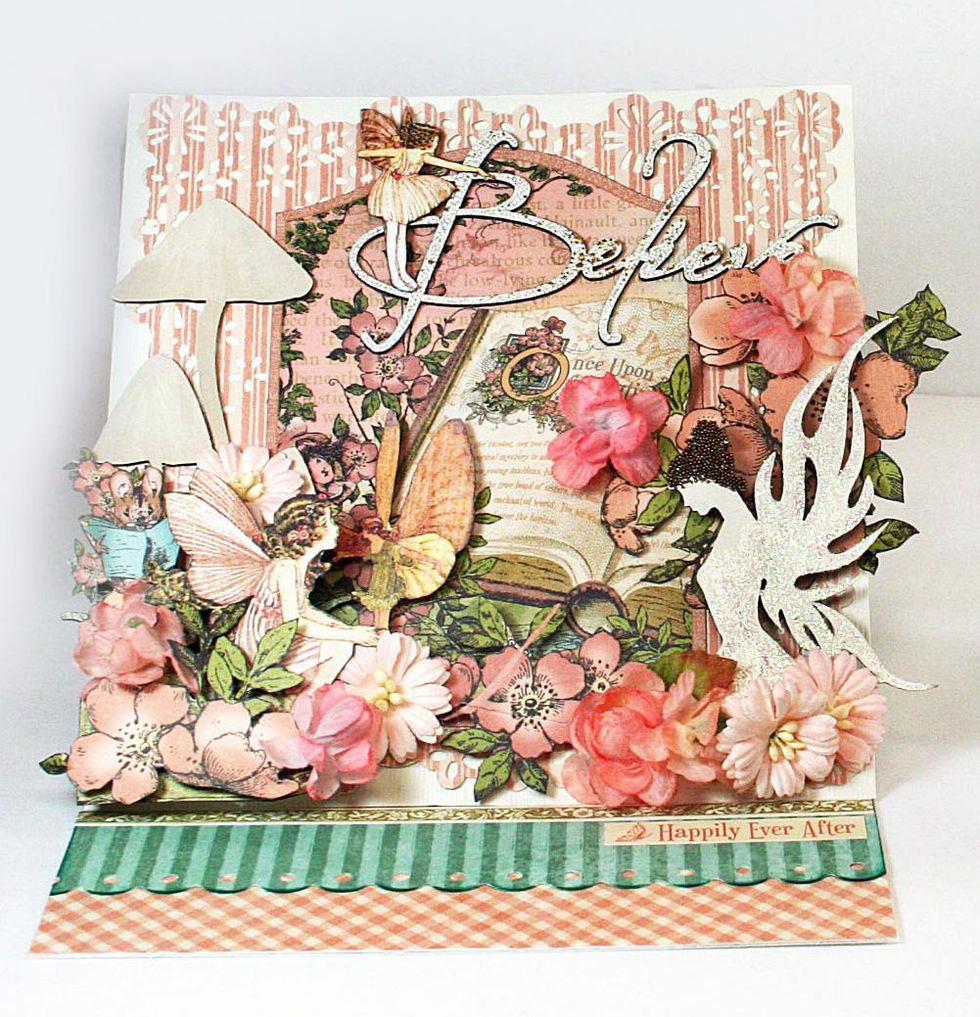 Add the chipboard fairy on the right and more fussy cut flowers in the center and overlapping the fairy on the left.