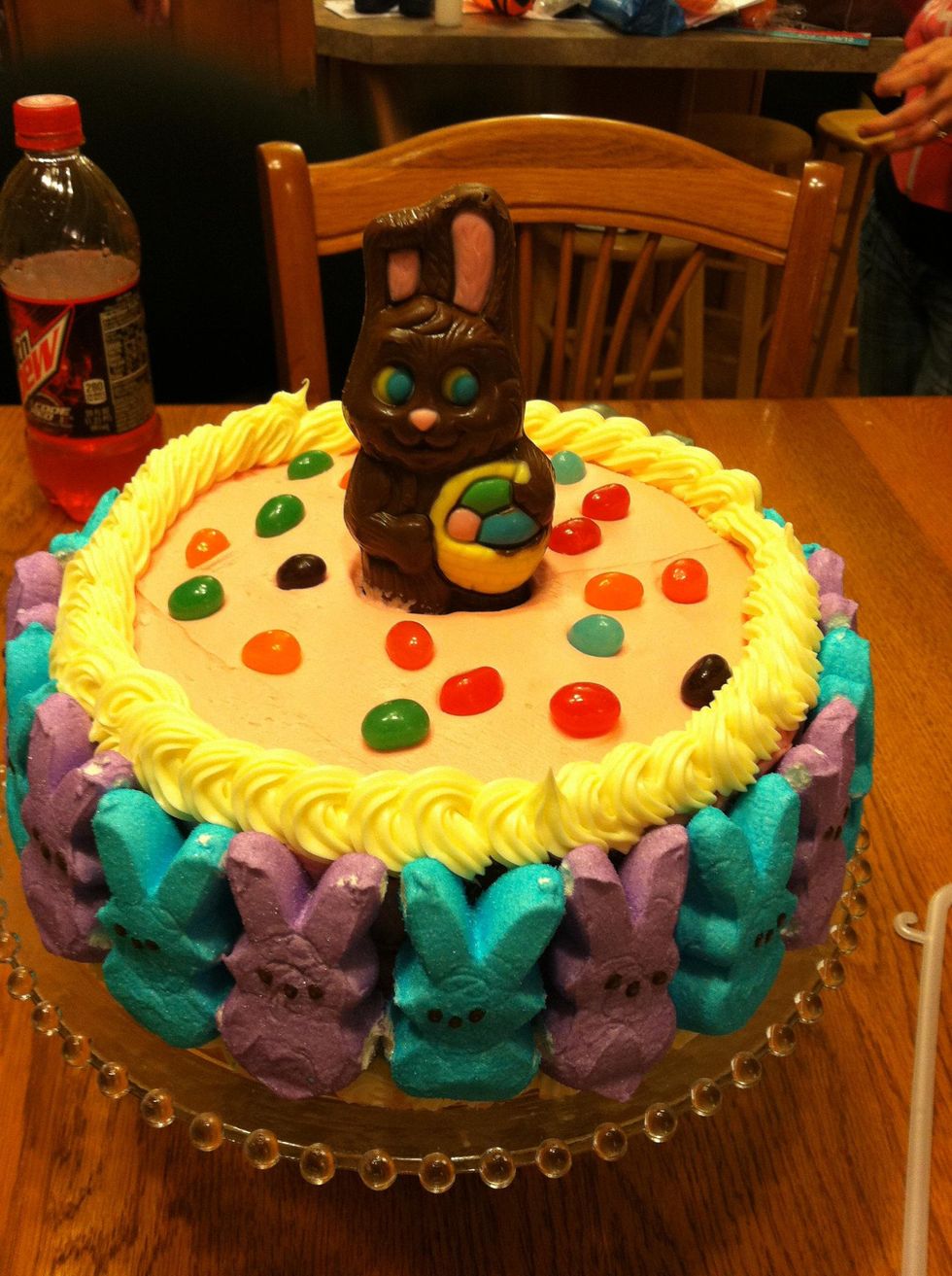Everything you need.Mix the batter.Bake it!Cool the cake The first layer is ready to frost.Decoration!!Add a little piping.Add peeps around the sides.Ta Da!!! A Bunny on top!!! A beautiful Easter cake!!