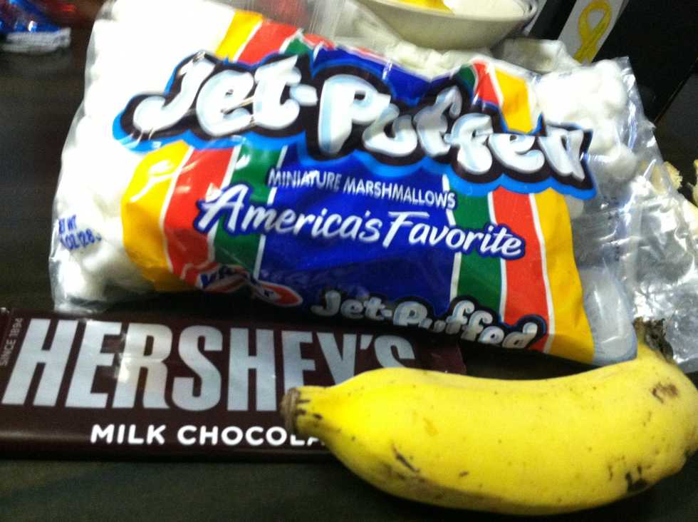 Gather your banana, chocolate (I use Hershey's), mini marshmallows (I use Jet-Puffed), and aluminum foil.