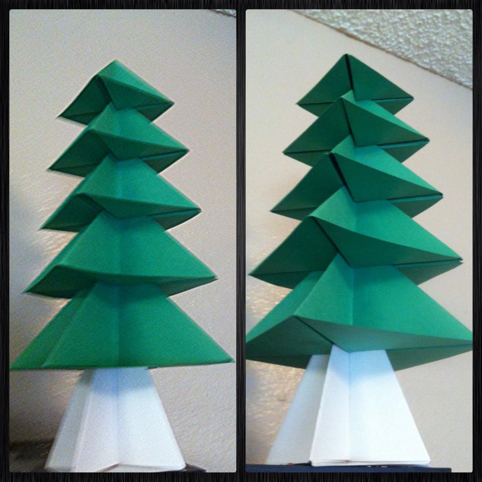 Make however many tree levels you want repeating all those previous steps. Make square base for trunk. Fold top corners to center. Repeat on back. Now take the bottom triangle & crease up.