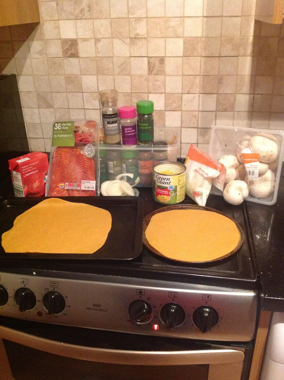 Knead the dough for a couple minutes and roll out on to a baking sheet; add toppings as desired.