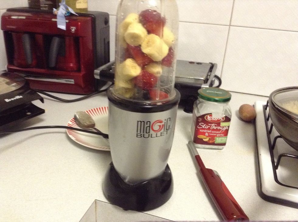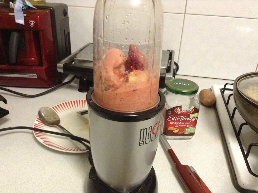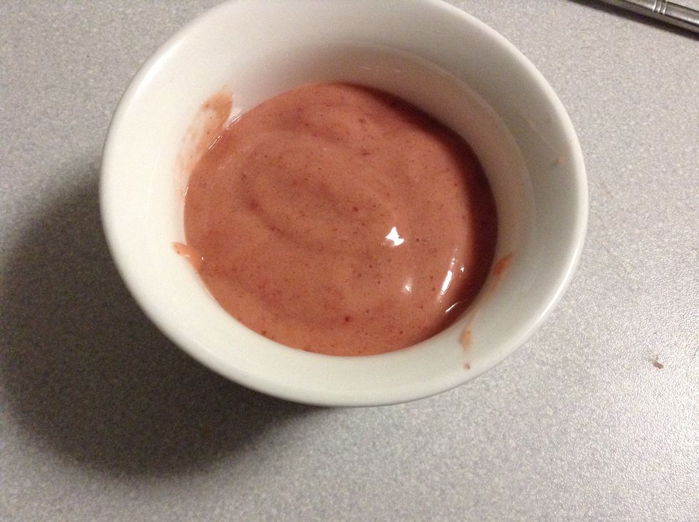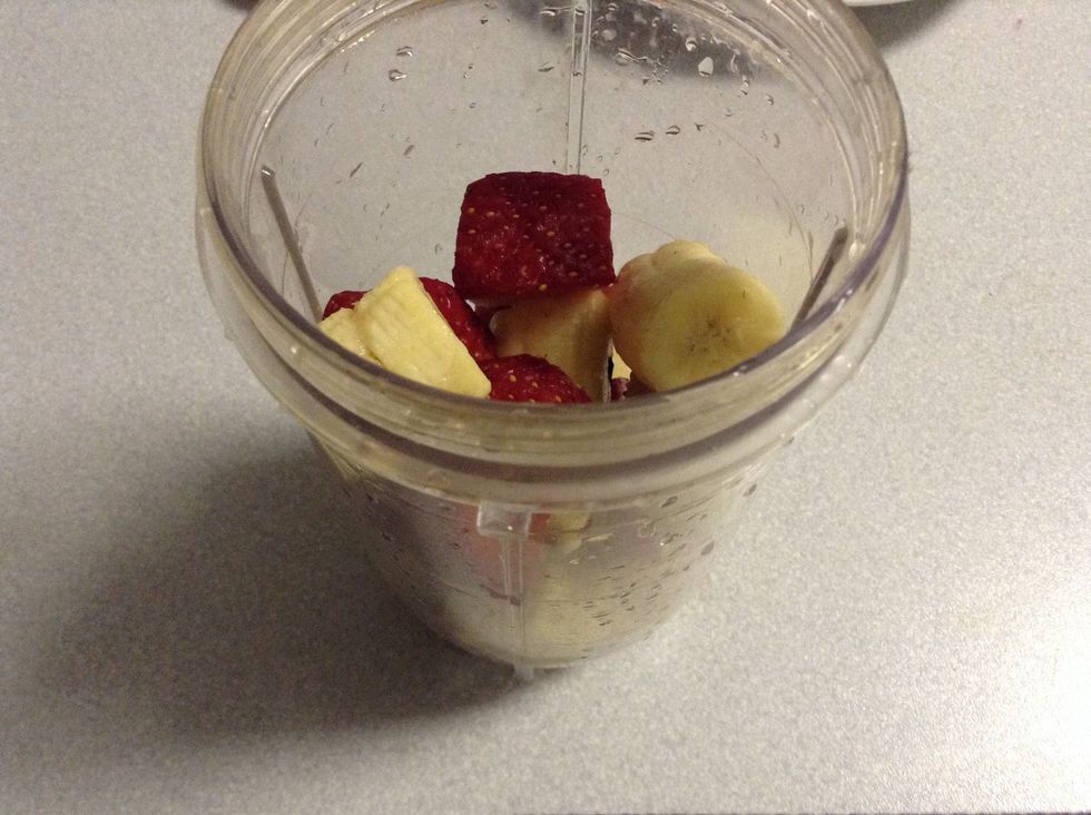Step 7. When your banana and strawberry sorbet has become a very nice creamy texture start scooping it out of the blender and into your small bowl.