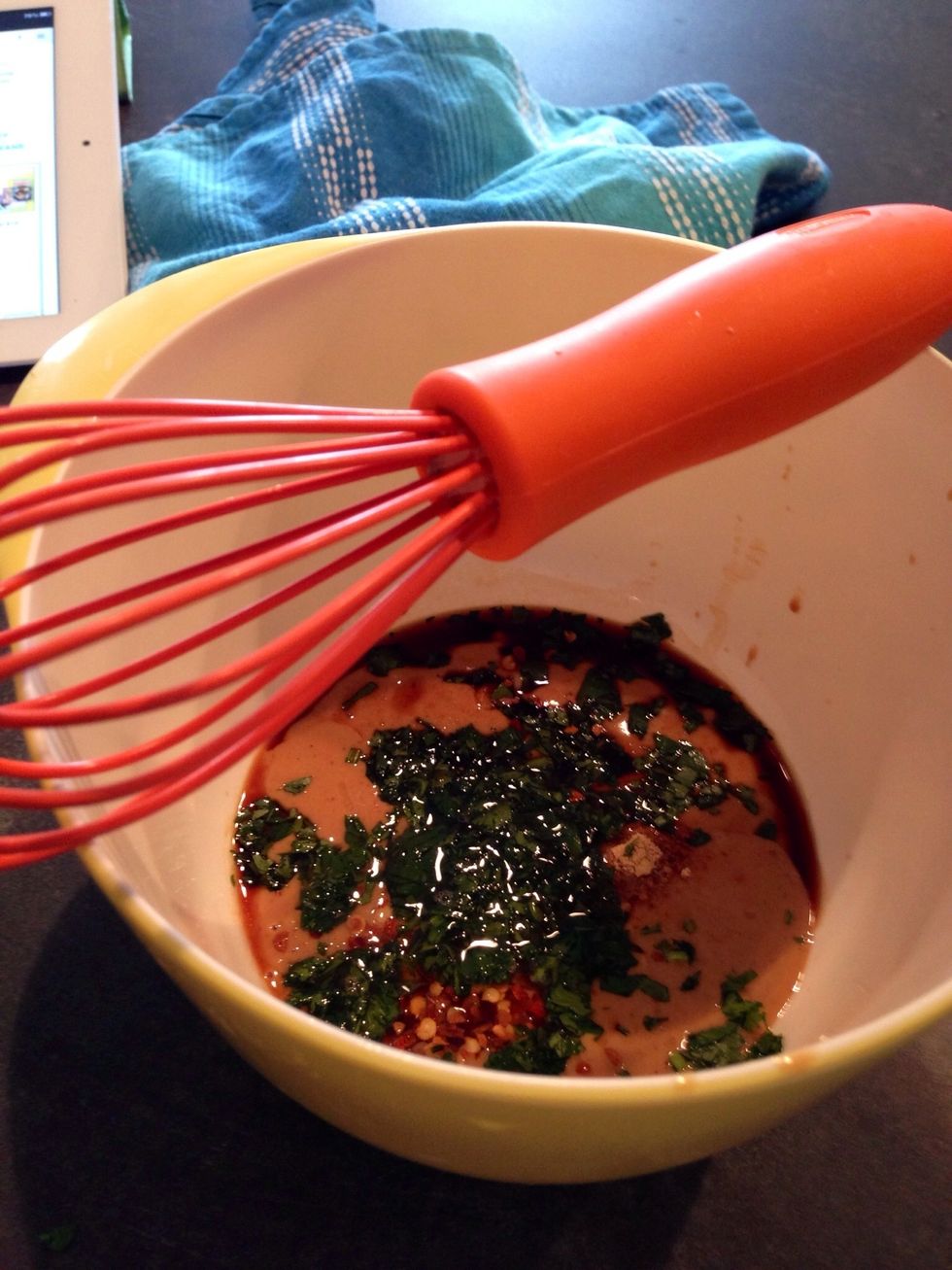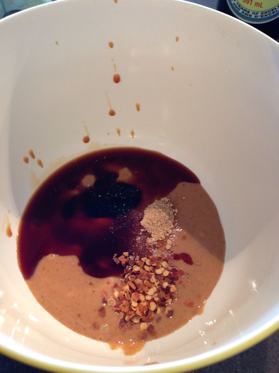 Measure and add the soy sauce and red chili flakes to the bowl.