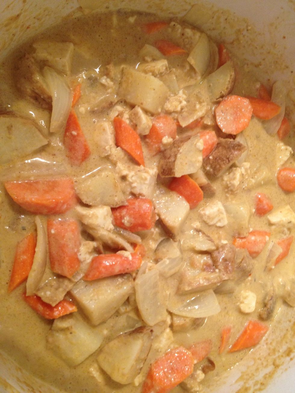 Add the curry sauce and the rough chopped potatoes to the vegetable sauté. Let summer until flavors marry. Check seasoning and add salt if desired.