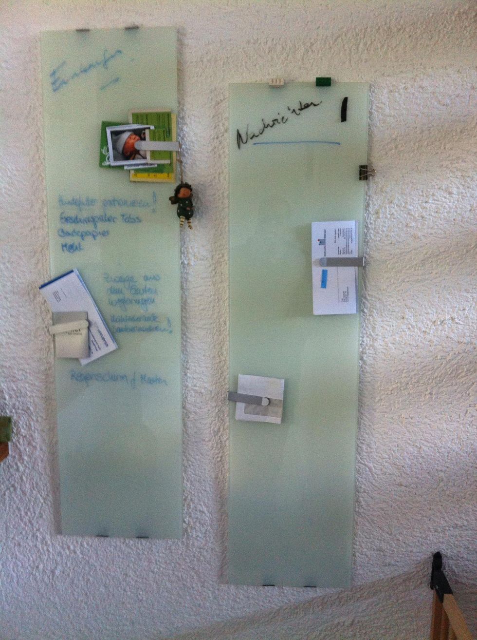 The Framsta glass panels from IKEA are supposed to go behind the TV. We discovered they make great whiteboards when simply hanged on the wall.