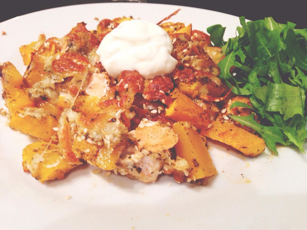 Ingredients: low fat grated mozzarella, fry light, garlic pureé, butternut squash, mixed herbs, sesame seeds, cajun spice, salmon fillet, garlic sea salt