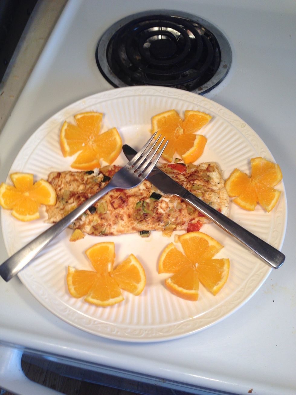 While the eggs are cooking take an orange and cut it into four equal sections that are still connected.