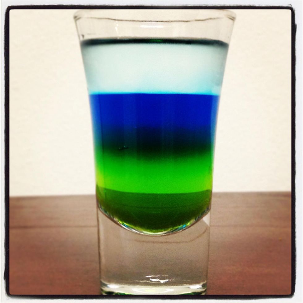 Slowly pour in a half ounce of Blue Curaçao. Use the back of a spoon to help the slow pour. Contact me for another way to slowly pour. :)