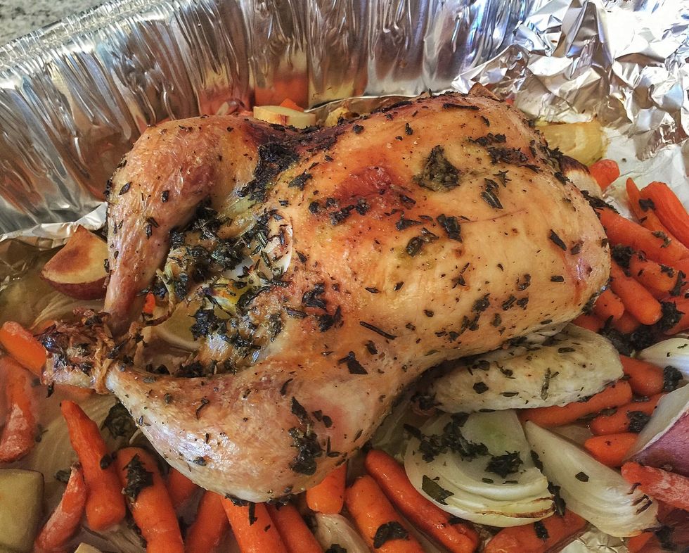 Place the chicken on the bed of vegetable and apply the herbs mix all over the chicken (back and front)