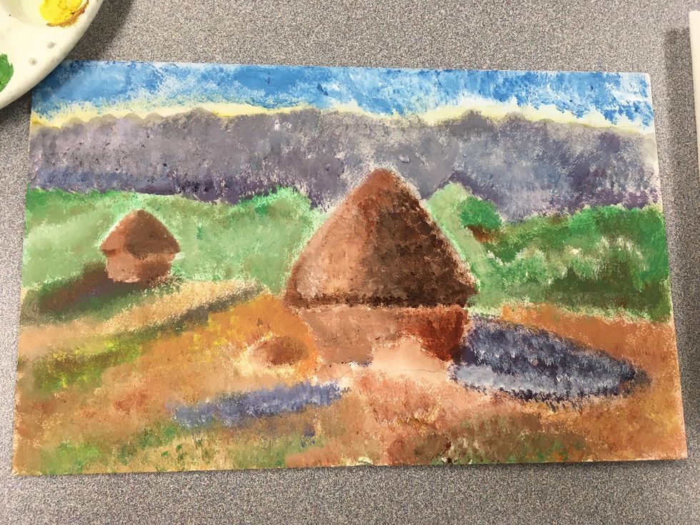 Using smaller stippling brushes begin to go over painting with acrylic paint using small strokes and dots.