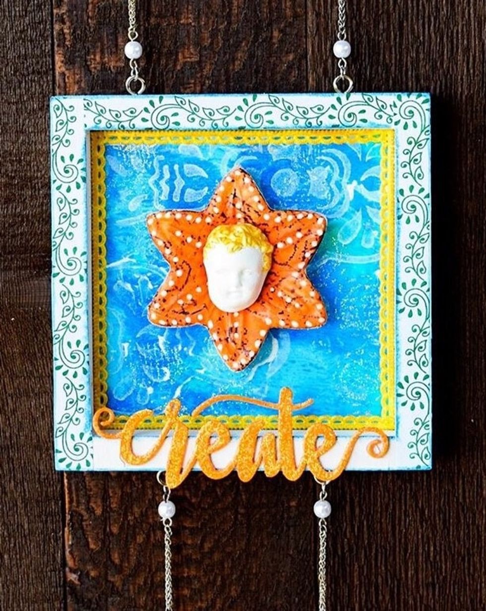 Glue down painted words and Relics & Artifacts® pieces. Attach frames using decorative chains or trims.