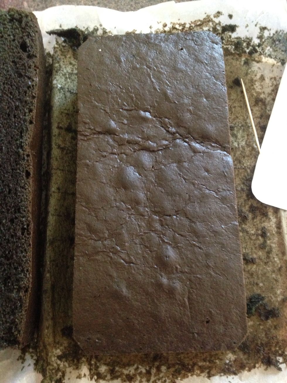 Bake your cake. This is a black velvet cake in a 9x13 inch pan. Recipe by Amanda from iambaker.net. I've used cocktail sticks to hold the template in place and then cut out the shape of the phone.