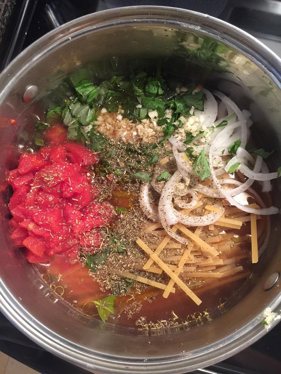 Gather your ingredients and thin slice the onion, chop the garlic and basil and cut the pasta in half for easier stirring. I used Italian herbs instead if oregano because I didn't have any.