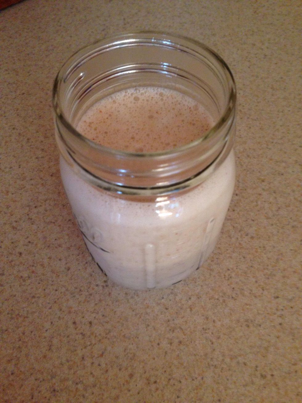 Add the handful of ice in the blender, then pour in the Almond Milk. You can use sweetened, unsweetened, vanilla, plain, chocolate, or regular milk... Whatever floats your boat.