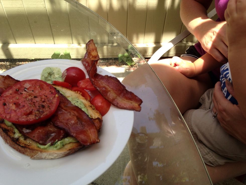 Take the toasted bread and slather it with the basil mayonnaise. Top with a few slices of bacon and slabs of tomato.