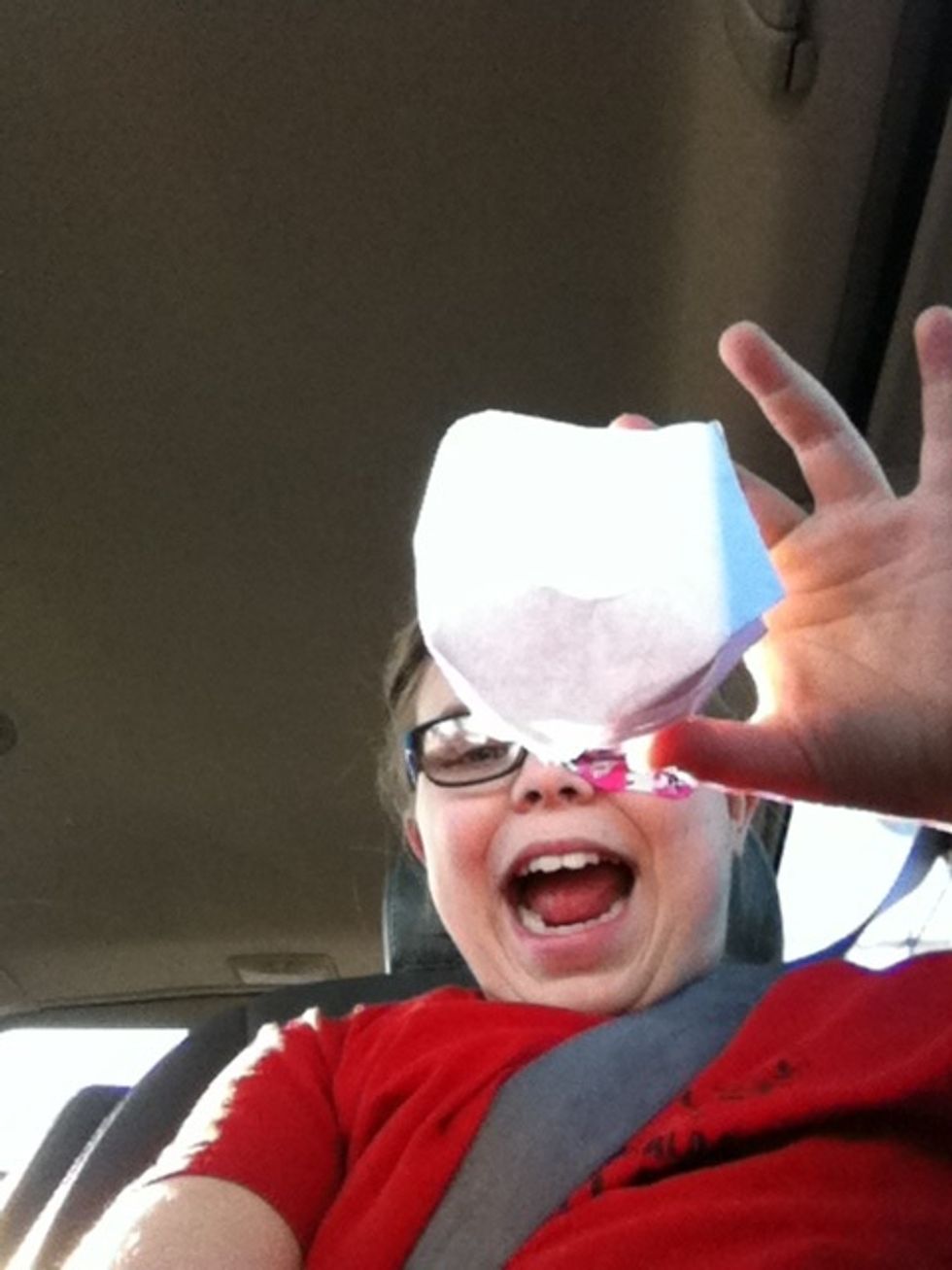 Unfold and fold into a rectangle. It should look like a rectangle with a triangle in the middle.