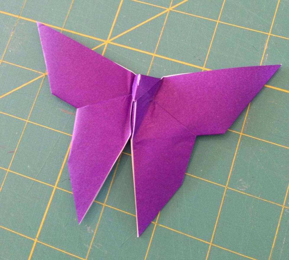See how the paper at the corners has shifted? Press these areas flat. It will separate the wings so it will look more like a real butterfly.