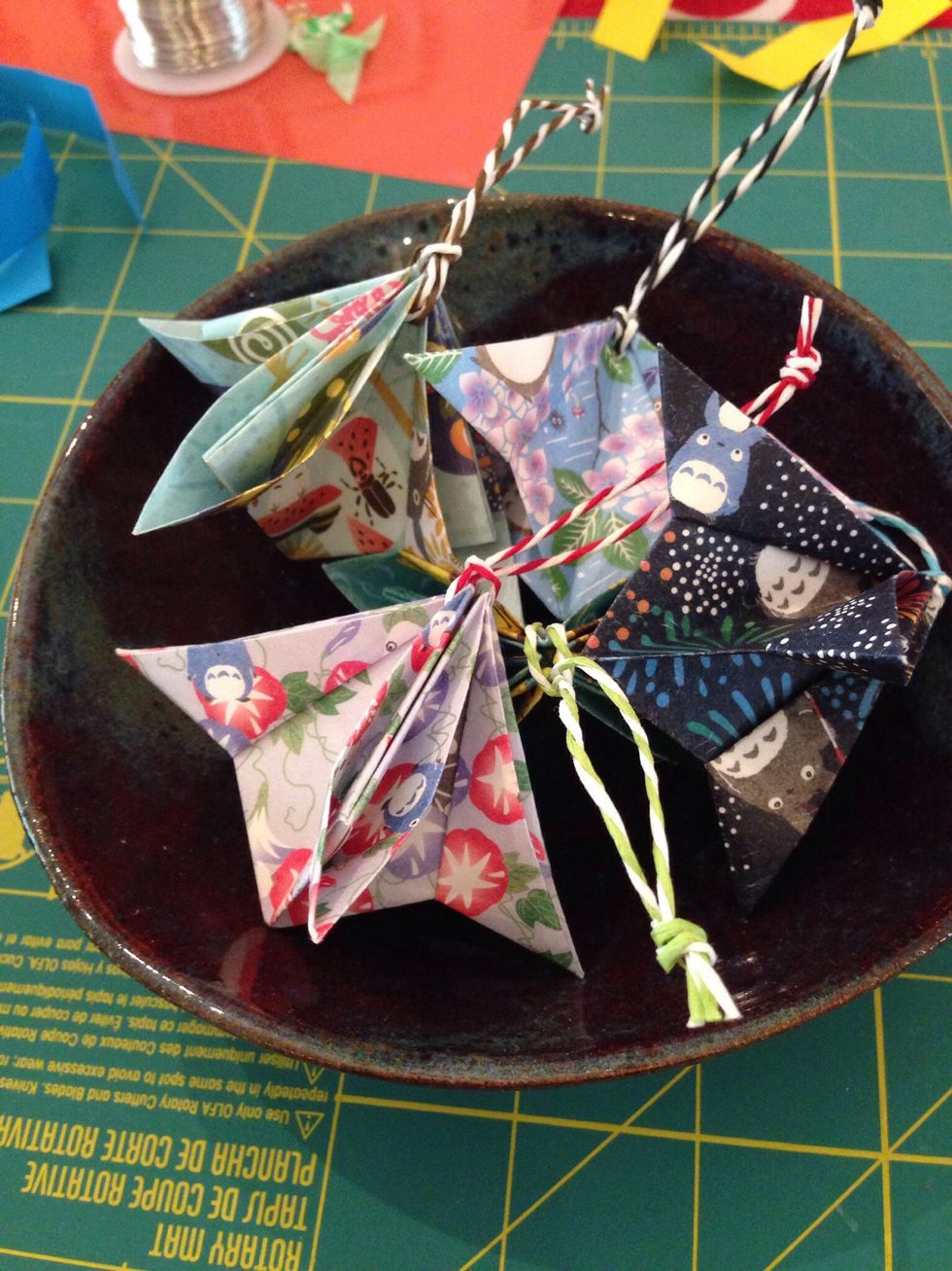 Here are some finished ornaments made from Totoro washi paper (I love Totoros!) and threaded with colorful paper cord.