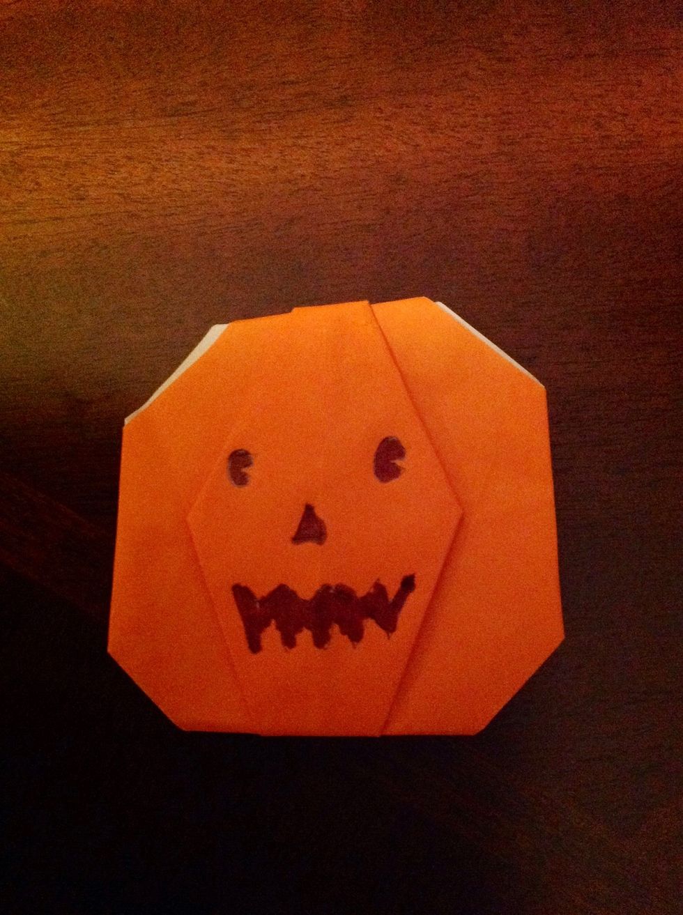 Flip your square over and fold down the four corners to give the pumpkin it's round shape. Flip it back over.