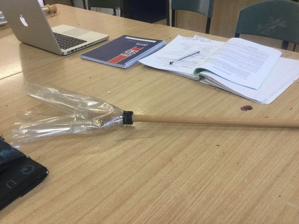 Then slot one of the bottles inside the other then put the dowel through the top of the bottle