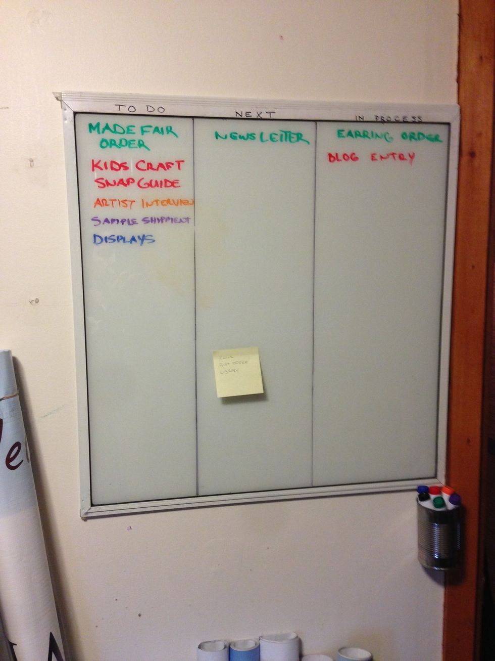 The mounted whiteboard. Notice our handy Upcycled dry erase marker holder.