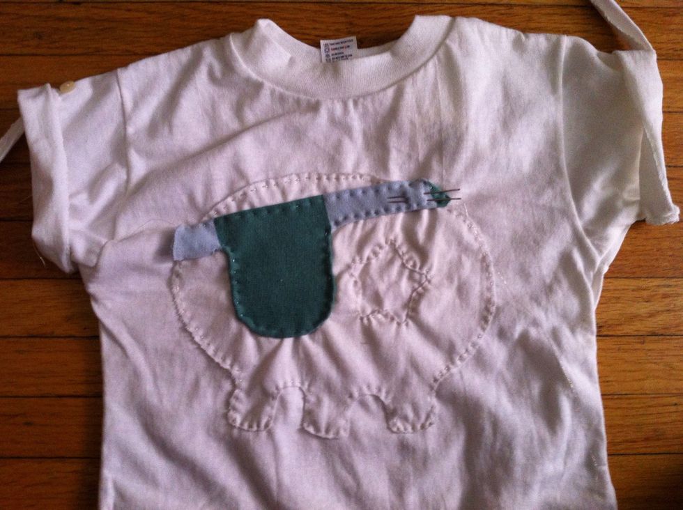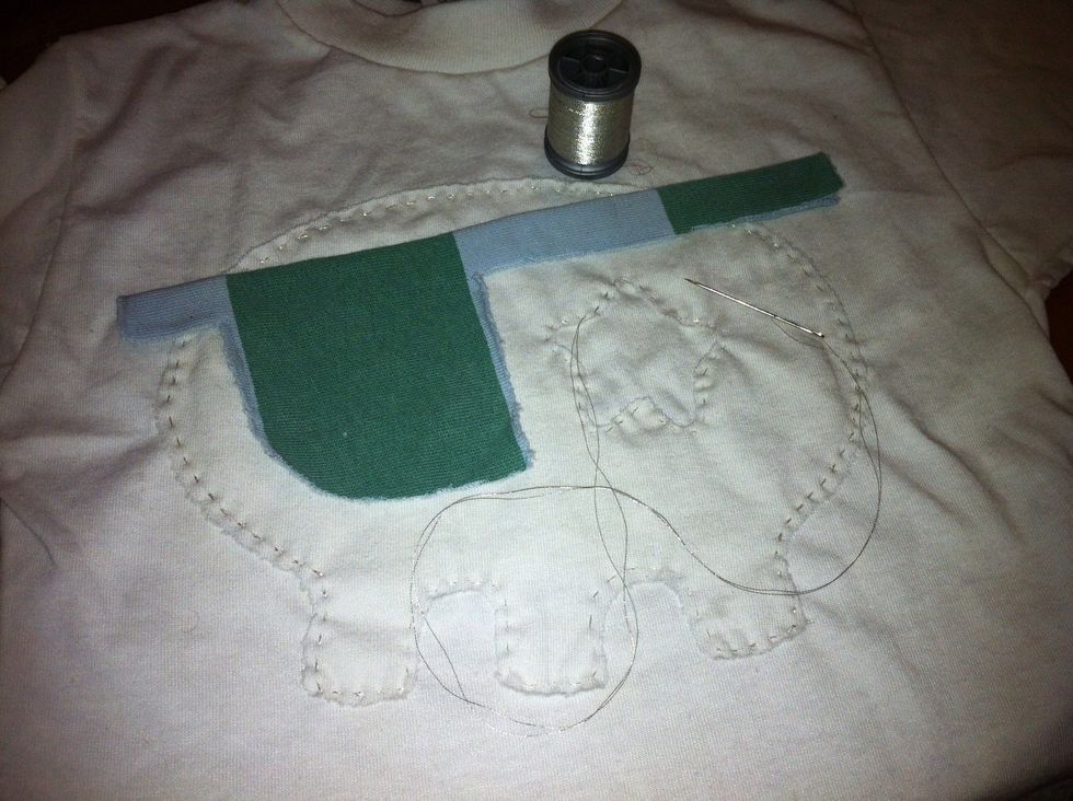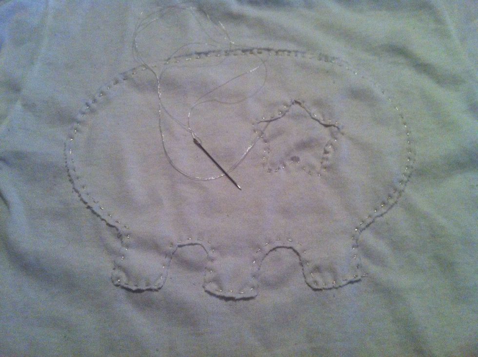 Using your threaded needle, do a running stitch around the border of your entire appliqué. Your stitch needn't be exact but do try to make it uniform. Repeat this step once or twice for durability.