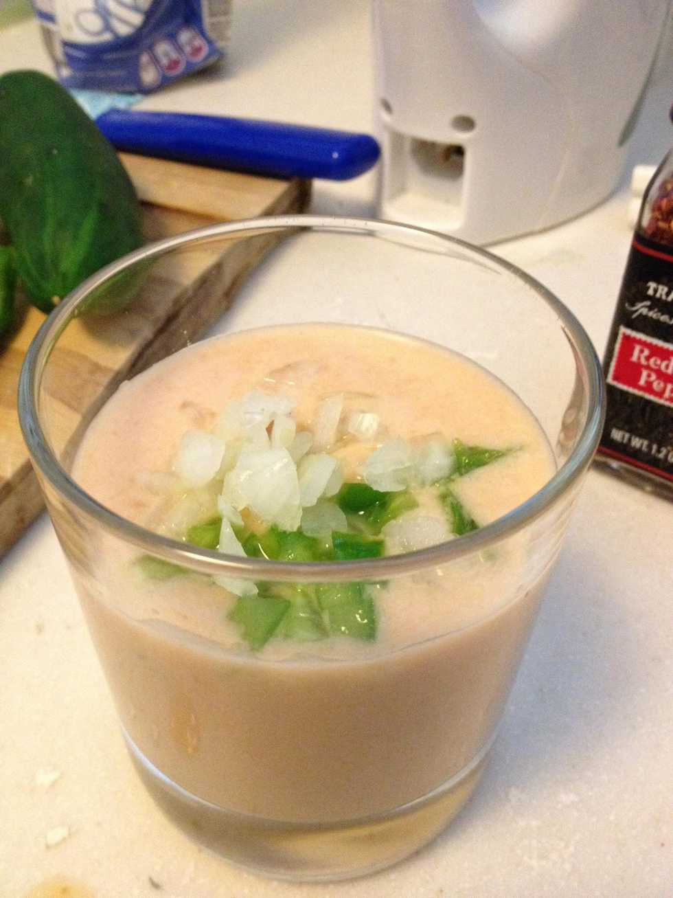 Add in chopped green peppers, onion, and cucumber to your liking. Ta-da!