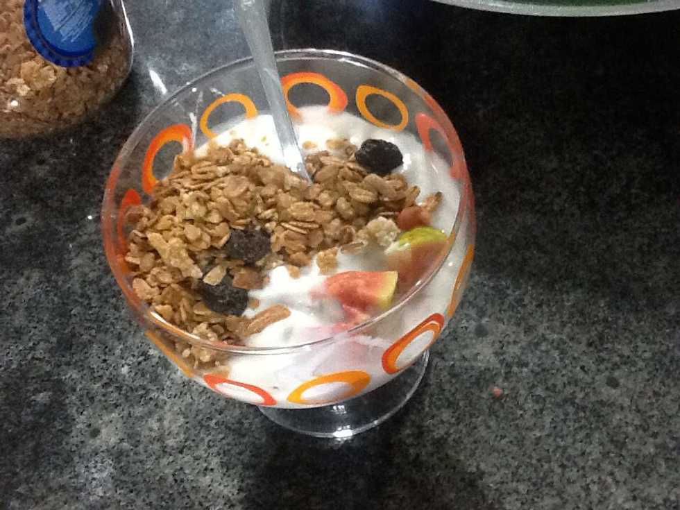 Add the guava and the banana + yogurt and the crystallised fruits and cereals into the cup you are going to use to have your food & it is done. Now you have a simple and healthy snack!