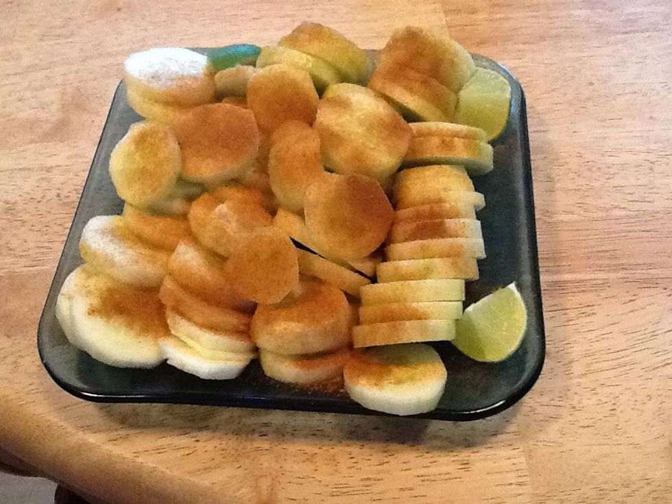 Peel cucumbers thenSlice cucumbers lay then like this on a plateSalt and limesput limes juice all over cucumbers thenMexican dried chile peppers with a touch of lime juiceShack on dried chile peppers and enjoy