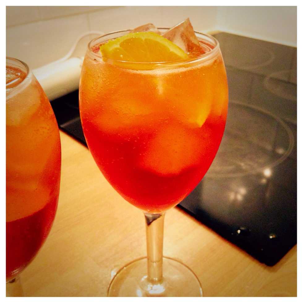 Fill the glass with Ice cubesPour AperolAdd as much prosecco as the aperol you poured alreadyFinish with some soda water, I used spriteAdd 1/2 a slice of orange and stir to mix the liquids. Enjoy!