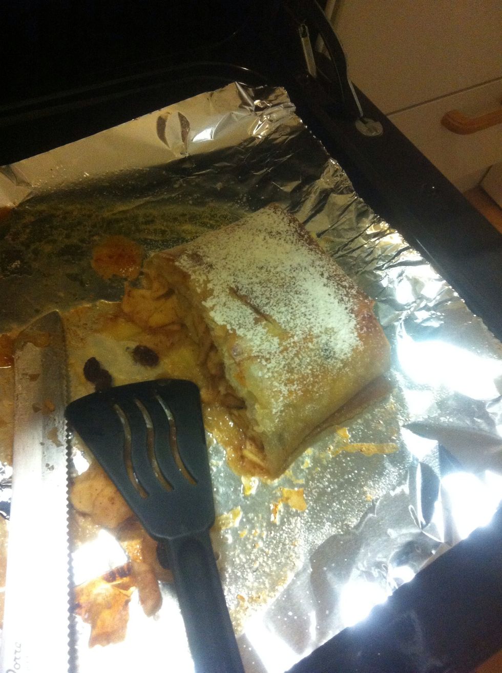 Bake 30 mins in the oven (preheated to 350F) until golden brown. Sprinkle powdered sugar and serve with vanilla ice cream.