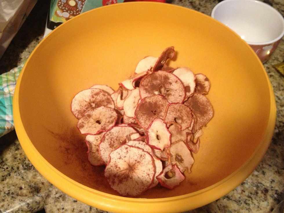 Sprinkle cinnamon on top of the slices. Preheat the oven to 200 degrees and place baking sheet with apple slices inside for 2 hours.