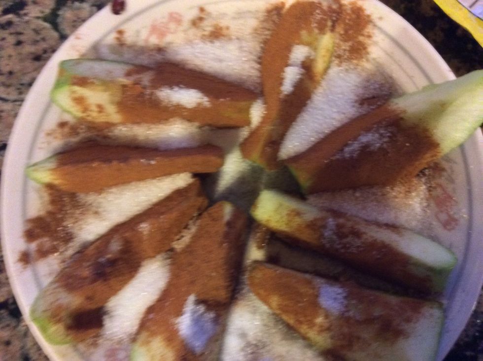 Next sprinkle the cinnamon equally on each apple slice
