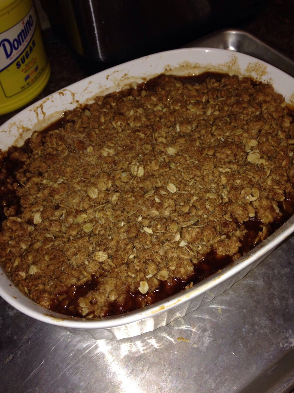 Put your dish on a sheet pan (if it boils over, you don't want it in the bottom of the oven) and bake for 45-60 minutes. Top should be brown and crisp and apples should be tender.