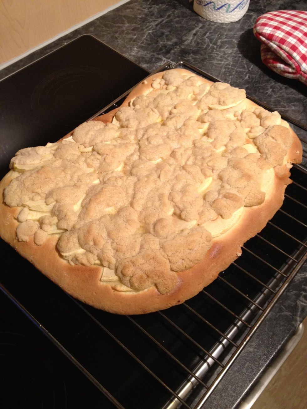 Add the crumble and put in the oven for 15-20 minutes. Reduce the heat 5 min after you had put in the cake by 20-30 deg.