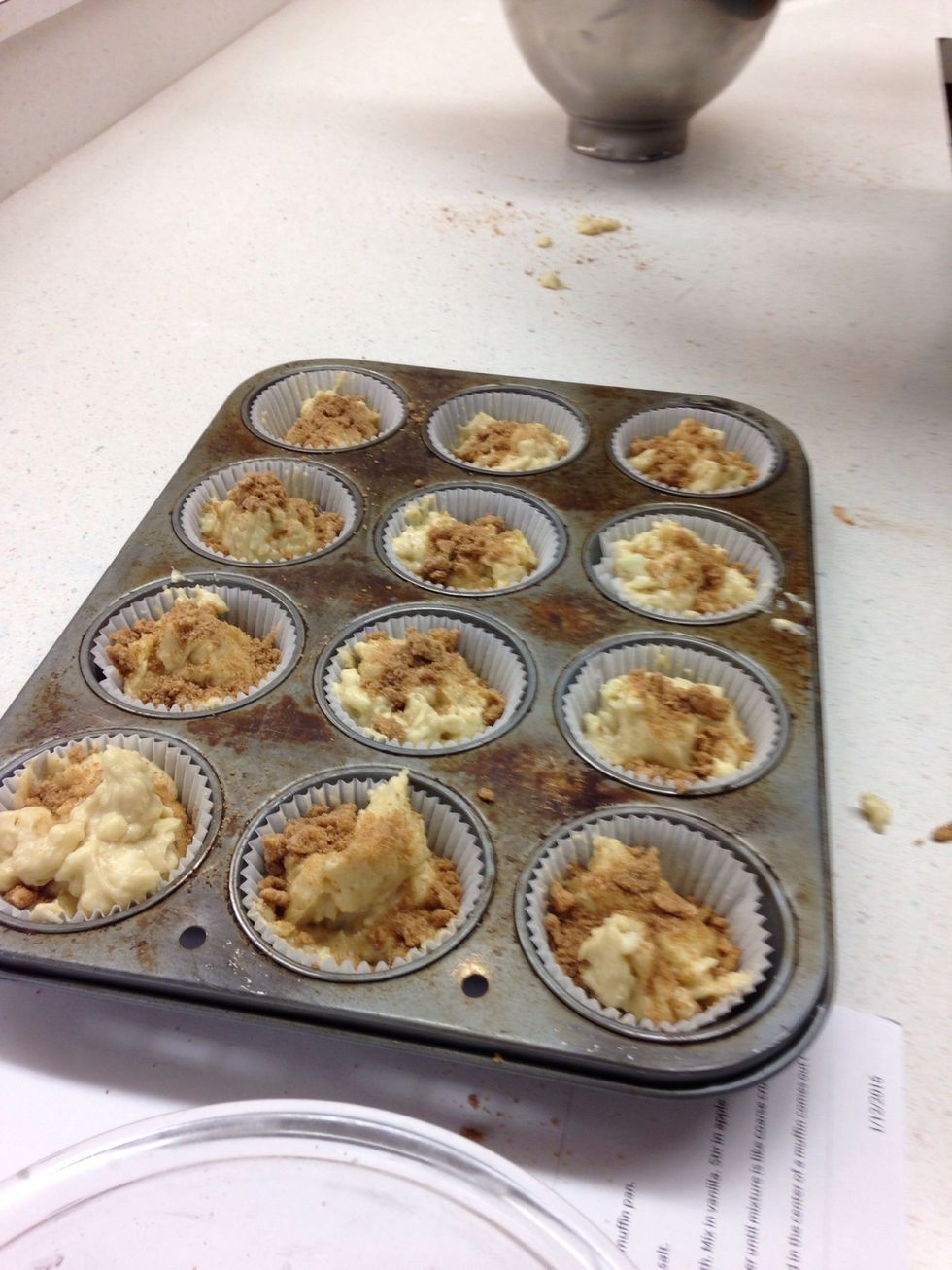 Place mixture into muffin pan and sprinkle crumbs on top.